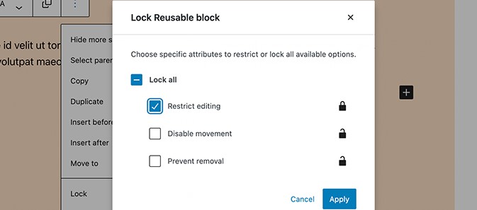 Thao tác này sẽ hiển thị một cửa sổ bật lên, nơi bạn có thể chọn các hạn chế về khóa. Bạn có thể khóa chỉnh sửa, di chuyển hoặc xóa khối.