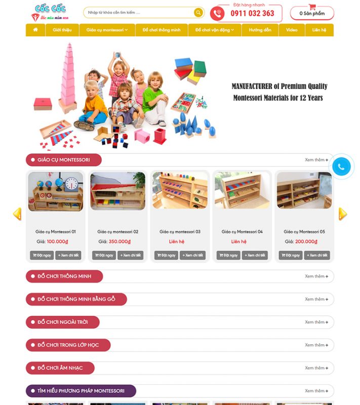 Mẫu "Website Cốc Cốc Sắc Màu Mầm Non" bao gồm nhiều tính năng phù hợp cho mục tiêu giới thiệu công ty, sản phẩm, dịch vụ và bán hàng: