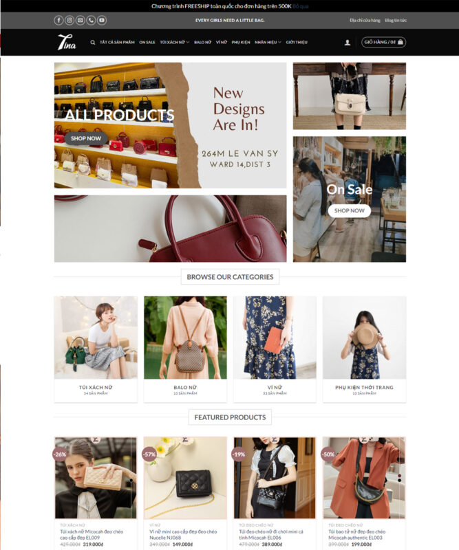 Giao diện "Website túi xách 01" phù hợp với các khách hàng kinh doanh về lĩnh vực thời trang hoặc phụ kiện