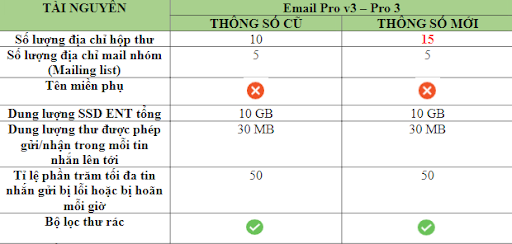 Thông số Email Pro 3 thay đổi so với Email Pro v3