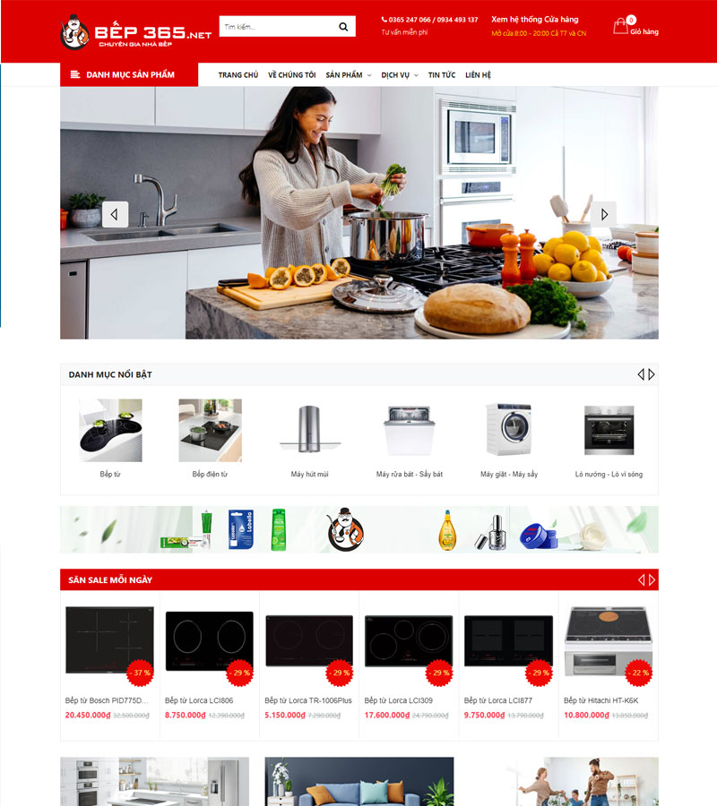 Giao diện "Website Siêu Thị Bếp 365" phù hợp với các khách hàng kinh doanh về lĩnh vực điện gia dụng hoặc đồ gia dụng