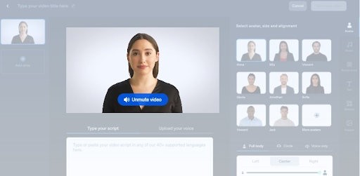 Một trình tạo video tuyệt vời là công nghệ AI Synthesia, một nền tảng tạo video AI cho phép bạn nhanh chóng tạo video bằng hình đại diện AI. Nền tảng này bao gồm hơn 60 ngôn ngữ và nhiều mẫu khác nhau, trình ghi màn hình, thư viện phương tiện, v.v.